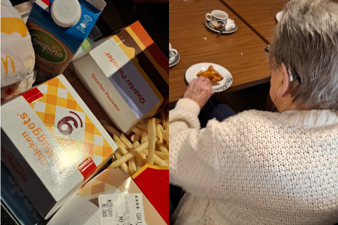 Met mijn zusje lunchen bij de gouden M en daarna met oma in het verzorgingshuis appelflappen maken.