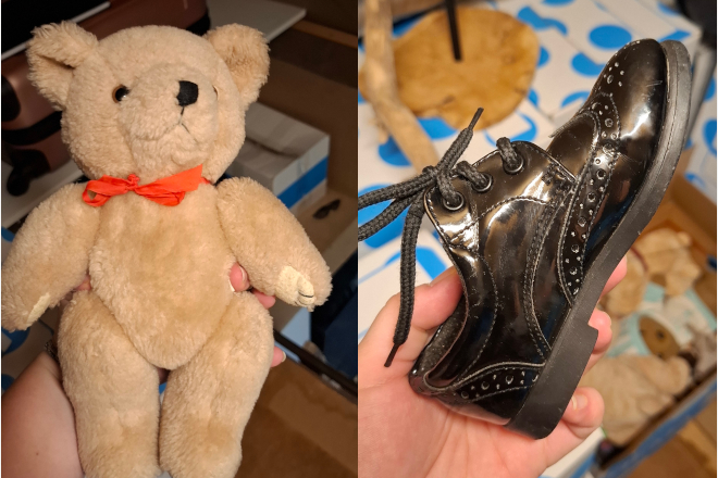 Ik kwam mijn oude teddybeer Urre tegen en schoentjes van vroeger.