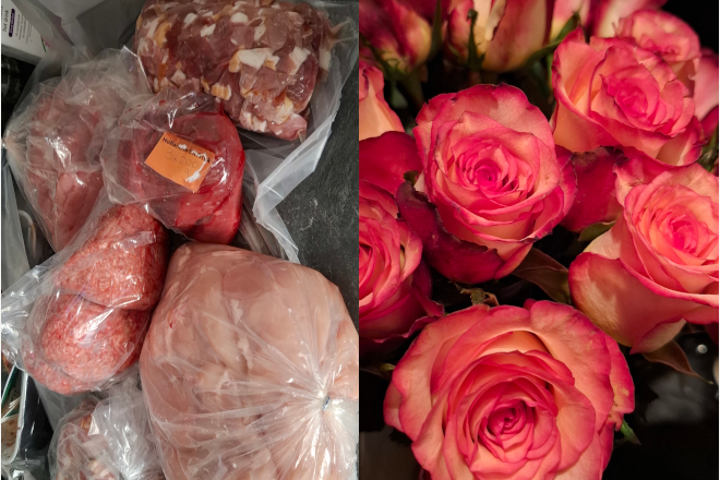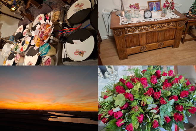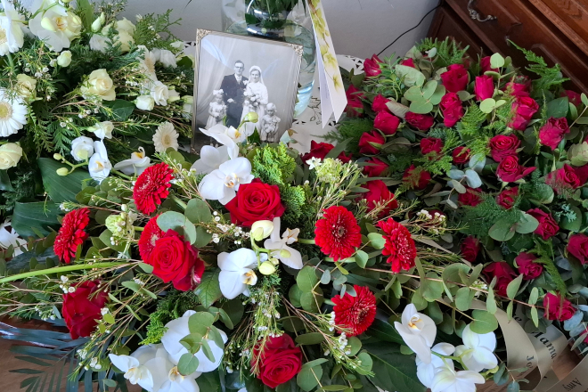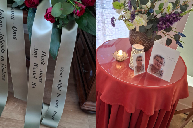 De rouwboeketten werden geleverd. Wessel heeft ze even netjes bij oma neergelegd tot we naar het crematorium gaan. Doordat kerst ertussen zit en er dan niet geleverd wordt, worden de boeketten al op woensdag geleverd.