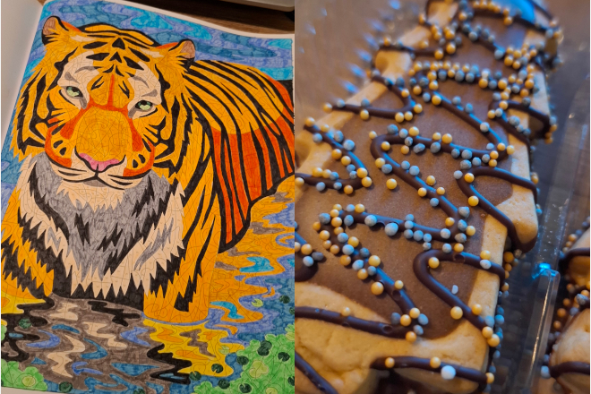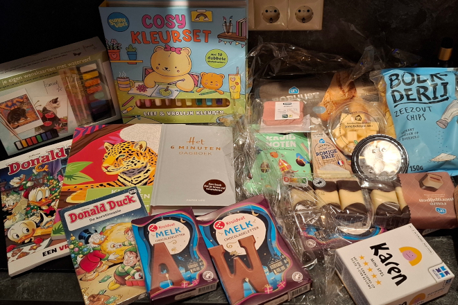 Wat Wessel en ik allemaal hebben gekregen (kleurboeken, Donald Ducks, spel, een borrelplank, chocoladeletters, verf en het 6 minuten dagboek.