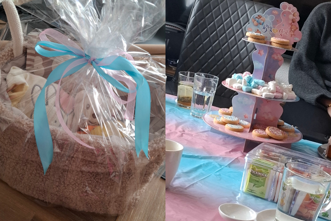 Mijn nichtje hield een gender reveal, dus ik had een mandje met een kleinigheidje meegenomen. Het wordt een jongentje!