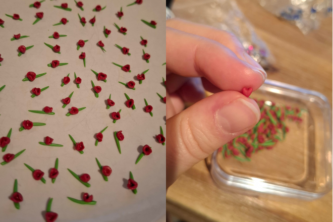 Mini gladiolen kleien van fimo klei voor de 4Daagse speldjes die ik maak.