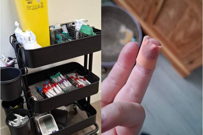 Bij de huisarts moest ik meteen bloed prikken op ontstekingswaarden, maar mijn vinger bleef heel erg bloeden.