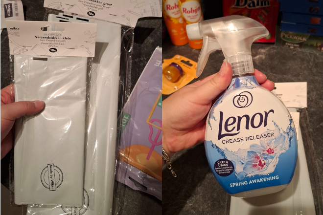 Verzendzakken bij de Wibra en deze Lenor geurspray voor op kleding/textiel.