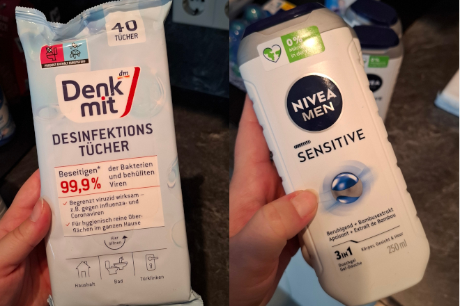 Desinfectie doekjes β¬0,95 en Nivea men douchegel 3 stuks. Die kosten hier β¬5,79 en bij de DM β¬1,95!!!