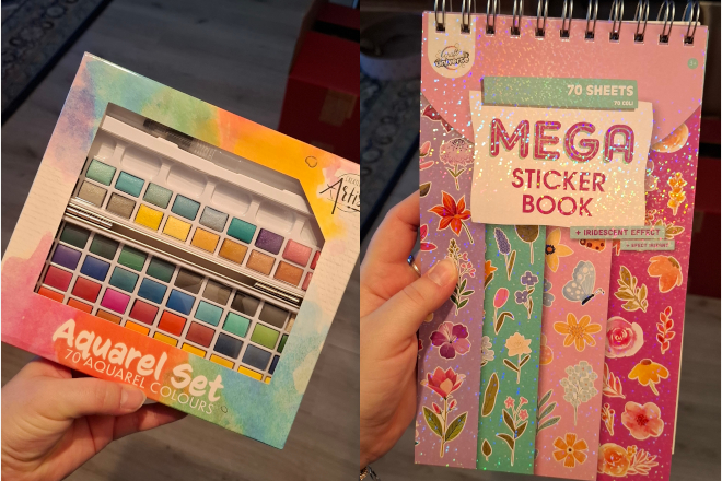 Waterverf palette met 70 kleuren β¬3,99 en mega stickerboek β¬1,99 allebei van de Action.