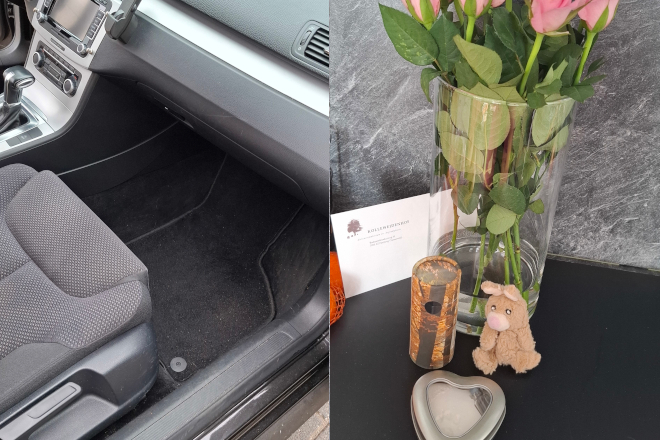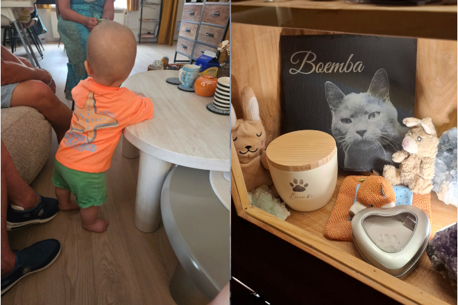 Boemba kreeg een mooi plekje in de kast Zijn urn, samen met zijn pootafdrukje, knuffeltjes en een gegraveerde leisteen.