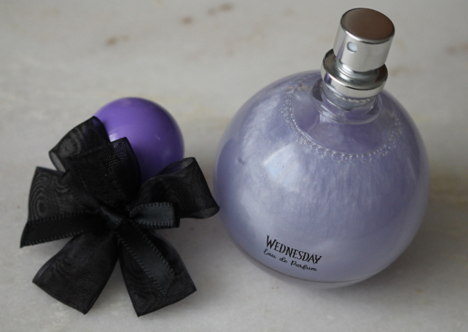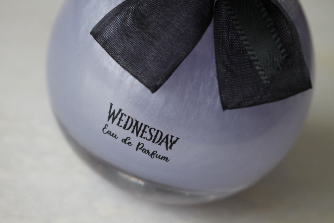 De Wednesday parfum zit, toepasselijk, in een mat zwart doosje met daarop allemaal kleine witte spinnetjes. De letters zijn zilver glanzend. Op de achterkant vind je een veiligheidswaarschuwing, de ingrediΓ«ntenlijst, de inhoud en nog wat logo’s.